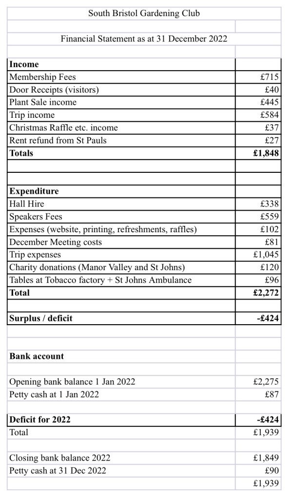 Plant sales at the tobacco factory market were slightly lower than in 2021, and the summer trip to RHS Rosemoor was less well attended than expected possibly due to some people being reluctant to take coach travel so soon after the pandemic and also due to the very hot weather at the time of the trip.