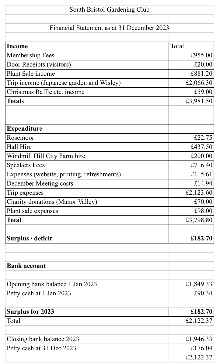 The 2023 South Bristol Gardening Club financial statement has been independently checked and verified as balanced and correct.